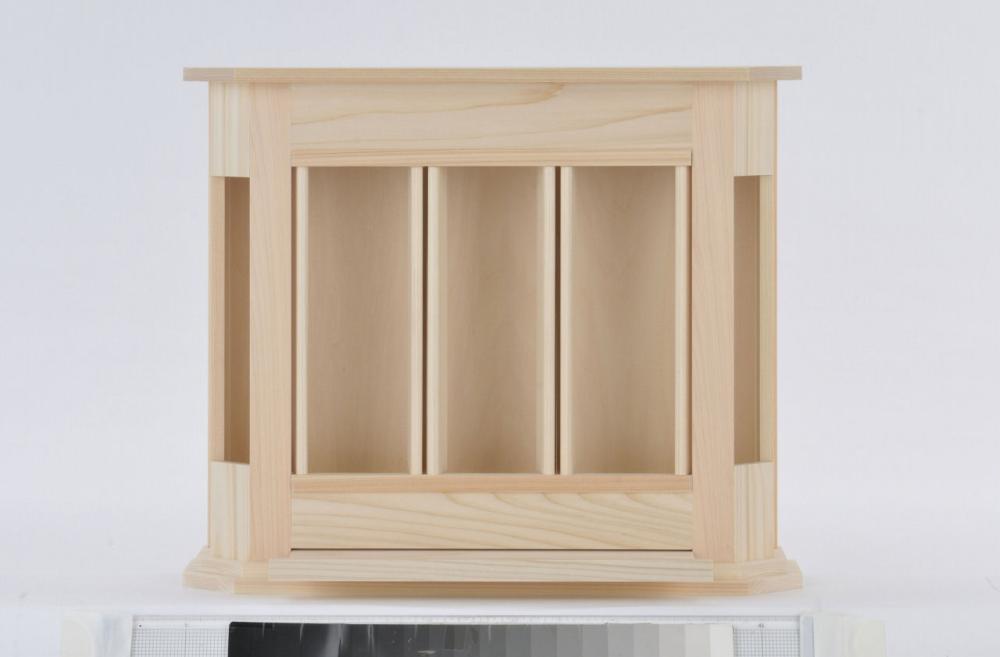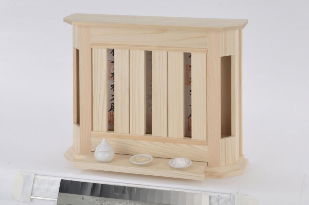 東農桧製。背面の金具で壁に直接取付可能。(ビス等はご用意ください)神具を乗せることのできる膳引出付き。