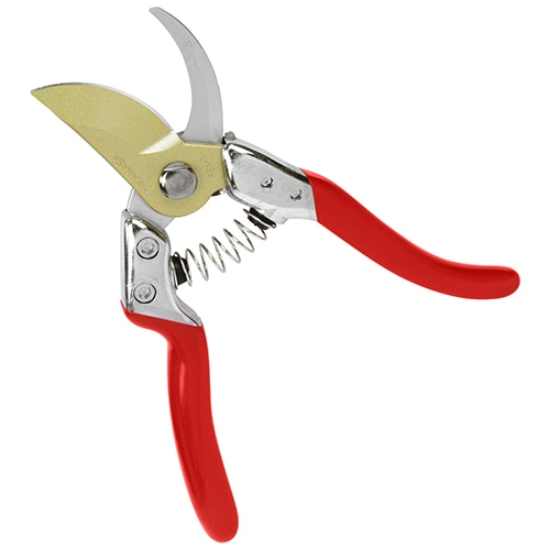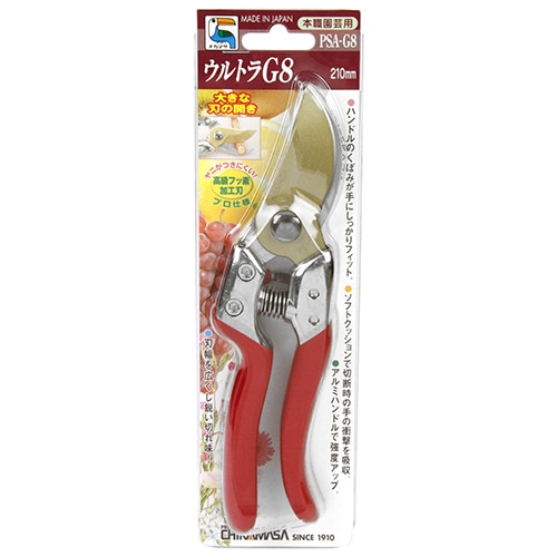 アルミハンドルで強度がアップしました。ハンドルの開きが小さく、ワイドに開く大きな刃です。高級フッ素加工刃で刃に付くシブやヤニの付着を防ぎ、スムーズな刃の開きを維持できます。ソフトクッションで切断時の衝撃を吸収します。ハンドルのくぼみが手にしっかりフィットします。