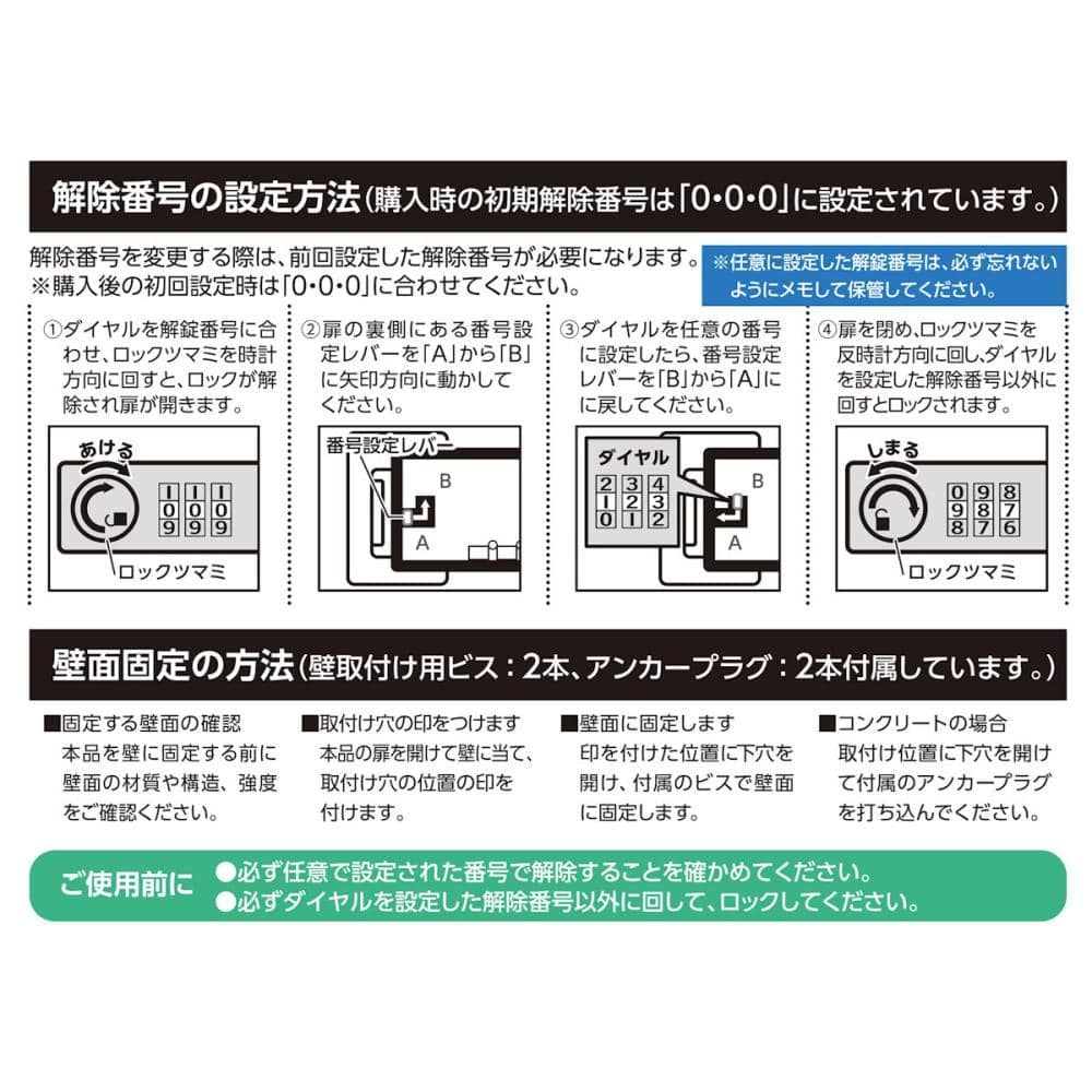 ●付属品:壁掛け用ビス×2本、アンカープラグ×2本、キーホルダー4色×5本、番号シール×1枚