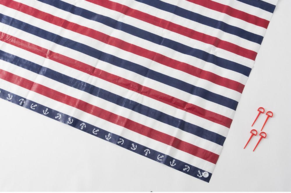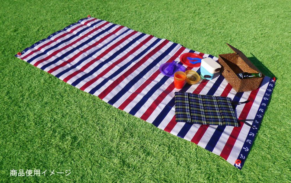 樹脂繊維を編みこんでいるので丈夫で破れない。 マリン柄のレジャーシートです。便利なシートピン付き