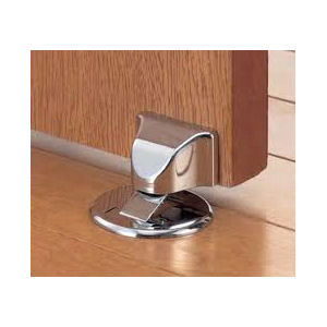 マグネットによる扉固定とラッチによるはね返り防止機能付。床側金具の厚みが薄く、歩行や掃除の邪魔になりません。クローム色は表面が美しいメッキ仕上げ。
