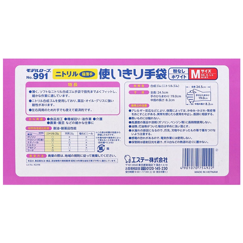特長 ●薄く、ソフトなニトリル合成ゴム手袋で指先までよくフィットし、細かな作業に適しています。 ●ニトリル合成ゴムを使用しており、薬品・オイル・グリスに強い体制があります。 ●左右両用のため片手でも使えて経済的です。 主な用途 ●食品加工 ●機械回り・油作業 ●介護 ●農業・園芸などの細かな仕事に 材料名:合成ゴム(ニトリルゴム) 寸法 全長:24.5cm 手のひらまわり:17.2cm 中指の長さ:7.9cm