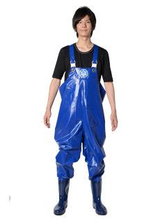 表面のPVC樹脂トッピングにより水、汚れの付着を防止。裏面のポリエステル素材は衣服との密着を防ぎます。胸当ての内側には小物が収納できる便利な胸ポケット付。吊りベルトは汚れが付きにくいPVC生地を使用。身長に合わせて長さ調節できるのでジャストフィット。ワンタッチバックルで着脱も簡単です。ブーツ部は耐油性長靴(ギャランG-100)使用。スレやすいヒザ部分はウェルダー溶接二重補強仕様。