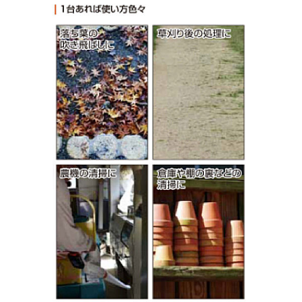 18V2.0Ahリチウムバッテリー使用 連続使用時間:高速約10分・低速約20分 充電時間:約70分 最大風速:高速約50m/s 低速約30m/s