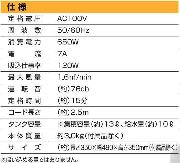 ●柔軟・丈夫なフレキシブルホース●吸いこむゴミに応じてフィルター交換●接続式でコンパクト収納●目的別にノズル交換(3種付属)●AC100V(50Hz/60Hz)●消費電力:650W●吸込仕事率:120W●最大風量:1.6m2/分●運転音:(約)76db●定格時間:(約)15分●コード長さ:約2.5m●タンク容量:集積容量(約)13L/吸水量(約)10L