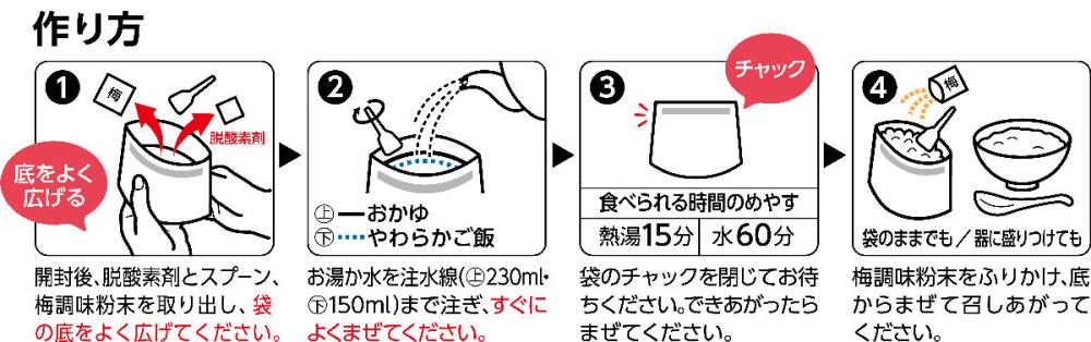 ご高齢の方や食欲がない方の非常食としても最適です。梅の具を最後に混ぜることで、梅の香りと味が一層引き立ちます。