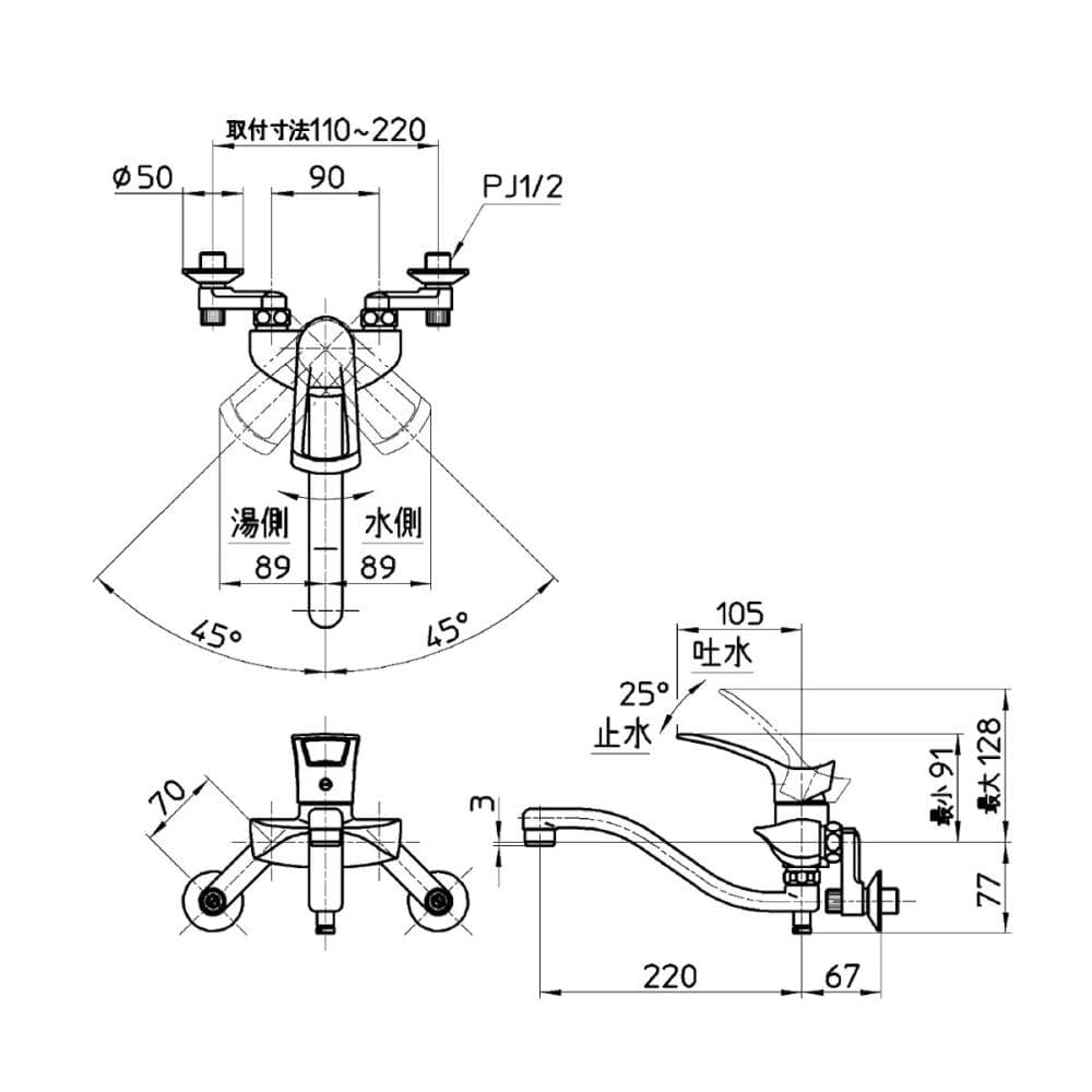 取付幅:120~220mm 配管取付部ネジ径:PJ1/2