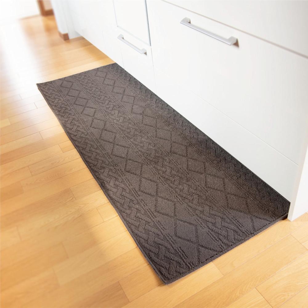 【材質】 パイル部:ポリプロピレン100% 【機能】 裏面滑り止め加工 床暖房対応 【原産国】 中国 ※使用上のご注意 ・マットに飛び乗ったり、床面が濡れていたりするとすべる原因となりますのでご注意ください。すべりやすい場合は市販のすべり止めネットを併用してください。 ・この商品の裏面にはすべり止め加工が施されているので、長時間同じ場所で使用したり、ホットカーペットや床暖房など暖房器具の上での使用は、すべり止め加工の成分が溶着したり、床面が変色することがあります。目安として1週間ごとに使用場所を移動したり、床面を拭いたりしますと溶着や変色の予防になります。 ・乾燥機のご使用はお避けください。 ・ドラム式洗濯機(ななめドラム式を含む)は絶対にご使用にならないでください。パイル(毛足)の抜け落ちや形状の歪みの原因となりますので手洗いをお勧め致します。