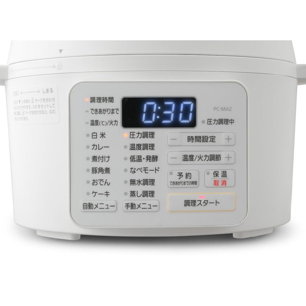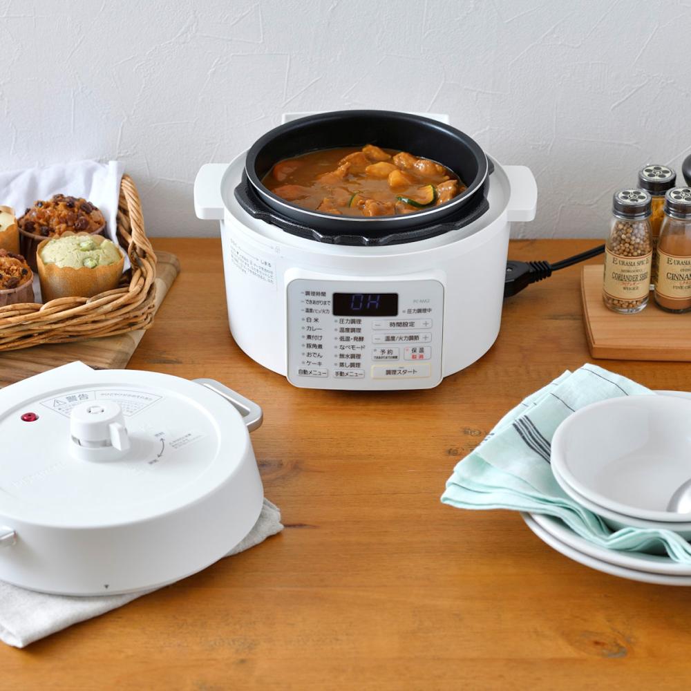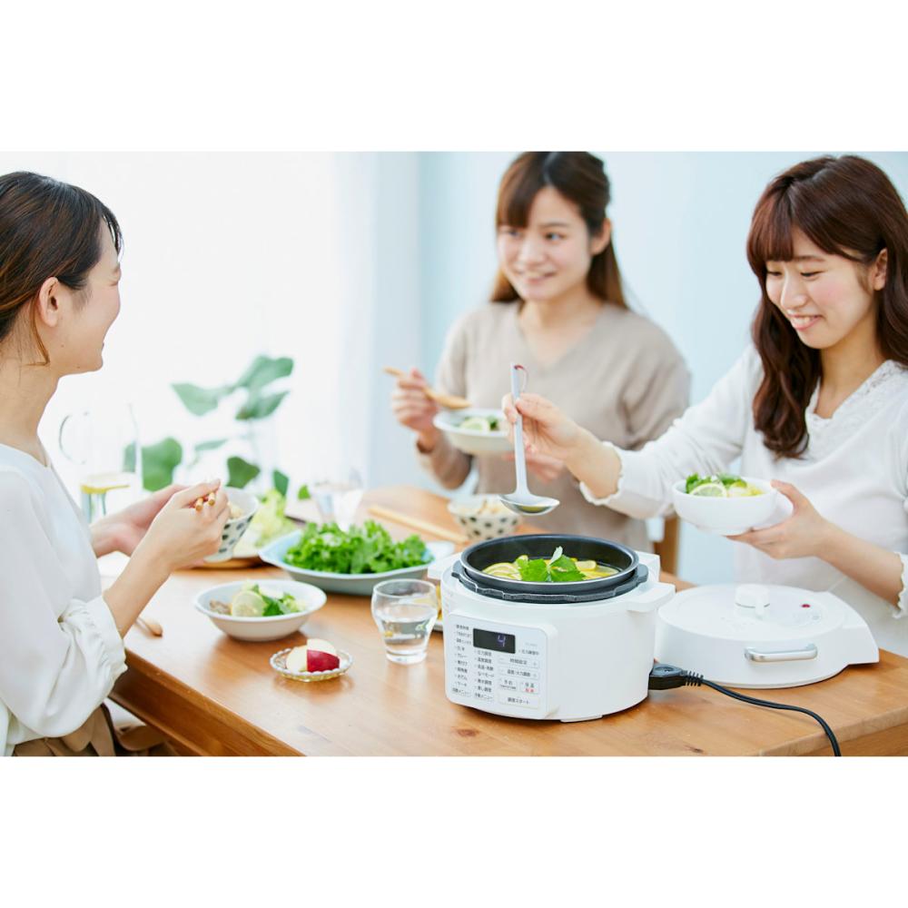 ●素材:ポリプロピレン、ABS樹脂、アルミ ●製品仕様/電源:AC100V(50/60Hz共用)、消費電力:800W、炊飯容量:3合(無洗米・白米)/2合(玄米)、最高圧力:70kPa、満水容量:2.2L、調理容量:1.4L、電源コードの長さ:約1.0m(マグネットプラグ) ●付属品:計量カップ、蒸しプレート ●保証期間:お買い上げ日より1年間