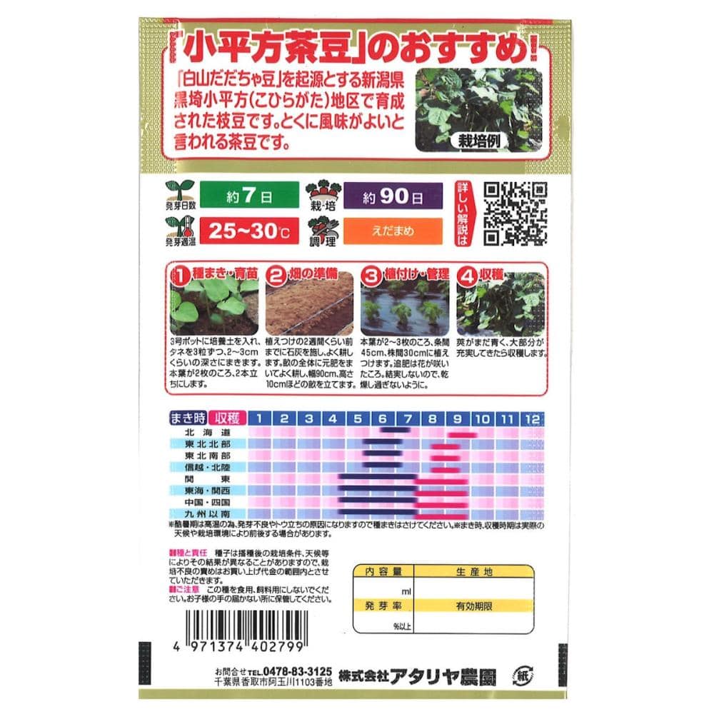 ●掲載のパッケージ画像(表側・裏側)に記載されている蒔き時期、収穫時期、発芽適温、発芽率、品種特長、その他注意事項をよくご確認の上、ご注文ください。