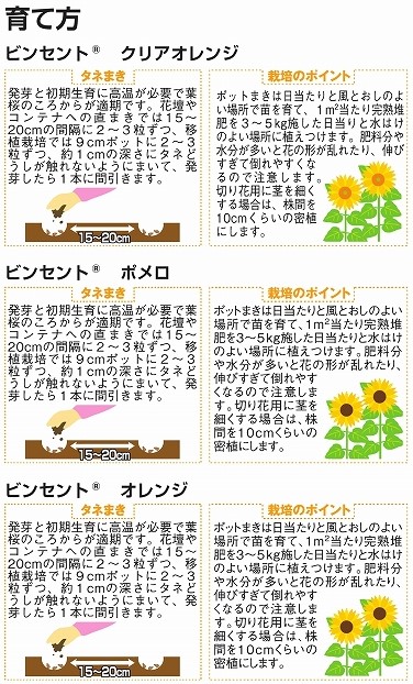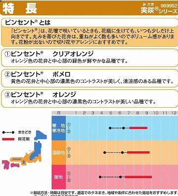 (1)ビンセントクリアオレンジ:オレンジの花弁と中心部の緑色が鮮やかな品種です。(2)ビンセントポメロ:黄色の花弁と中心部の濃黒色のコントラストが美しく、清涼感のある品種です。(3)ビンセントオレンジ:オレンジ色の花弁と中心部の濃黒色のコントラストが美しい品種です。
