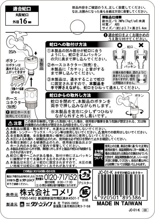 材質/ABS 耐水圧/0.7MPa未満 適合蛇口/横水栓、万能ホーム水栓、自在水栓の外径16mmの丸型蛇口