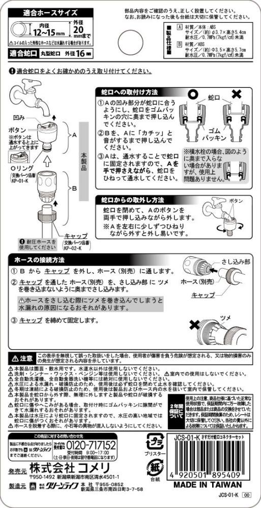 材質/本体:ABS 耐水圧/0.7MPa未満 適合ホース/内径12~15mm、外径20mmまで (※コイルの入った特殊なホースなどは水漏れする場合もあります。) 適合蛇口/横水栓、万能ホーム水栓、自在水栓の外径16mmの丸型蛇口