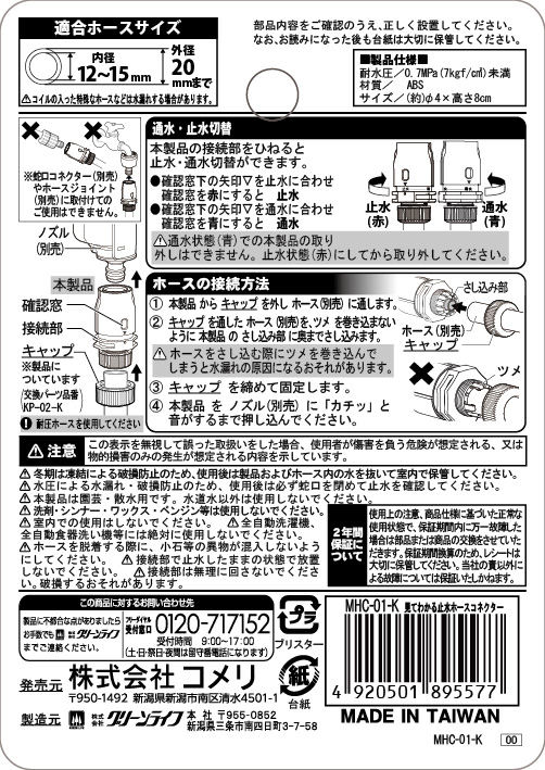 材質/ABS 耐水圧/0.7MPa未満 適合ホース/内径12~15mm、外径20mmまで (※コイルの入った特殊なホースなどは水漏れする場合もあります。)