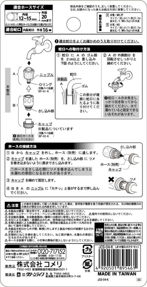 材質/ABS、PP 耐水圧/0.7MPa未満 適合ホース/内径12~15mm、外径20mmまで (※コイルの入った特殊なホースなどは水漏れする場合もあります。) 適合蛇口/万能ホース水栓、自在水栓の外径16mmの丸型蛇口