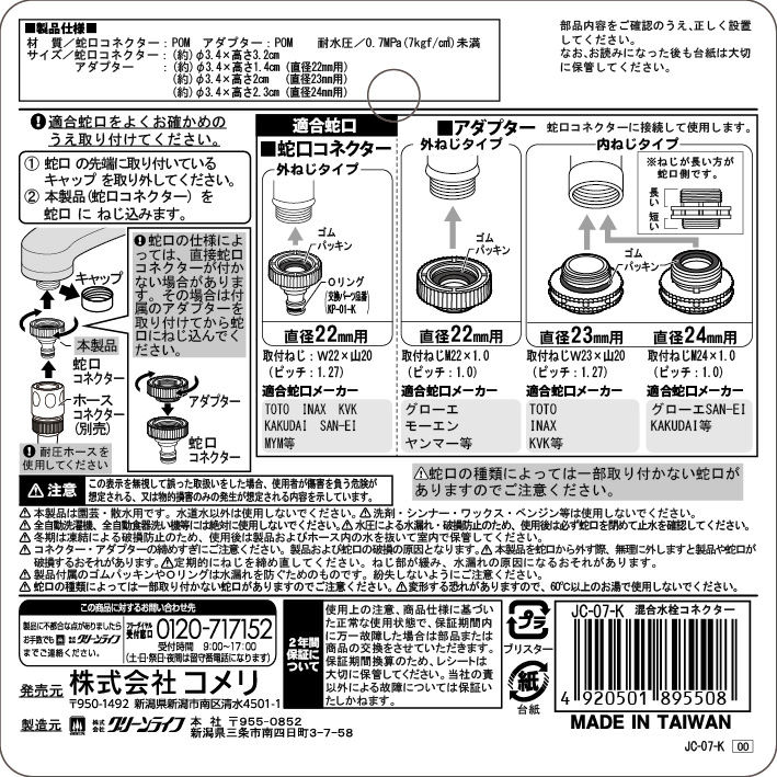 単品サイズ:蛇口コネクター:(約)直径3.4×高さ3.2cm