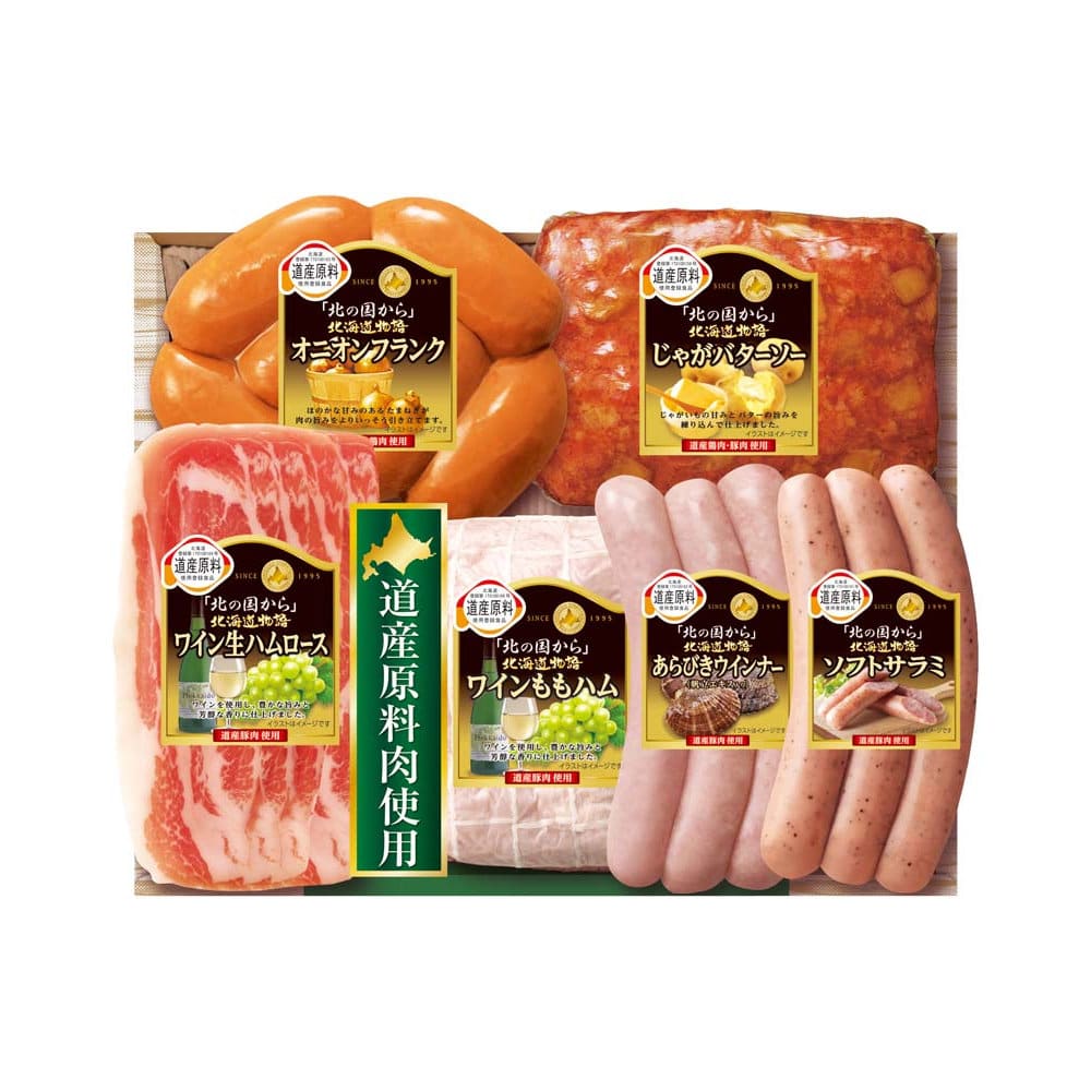【セット内容】ワインももハム130g、ワイン生ハムロース35g、じゃがバターソー180g、オニオンフランク180g、ソフトサラミ75g、あらびきウインナー(帆立エキス入り)75g