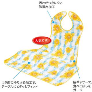 ●表地は汚れがつきにくく、落としやすい強撥水加工、裏面は安心の防水加工です。 ●ロング、幅広サイズでトレイもゆったり、さらに両側にギャザ-が付いているため食べこぼしをしっかりキャッチし衣服を汚しません。 ●素材はポリエステルシフォンで適度に張りがあり、手のひらに心地よく身体にまとわりつきません。 ●防水素材のためお洗濯後脱水の必要はありません。 ●首まわりのサイズ調整ができるマジックテープ付き。