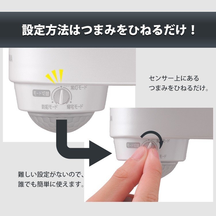 ・点灯モード切替:防犯モード/常灯モード/帰宅モード