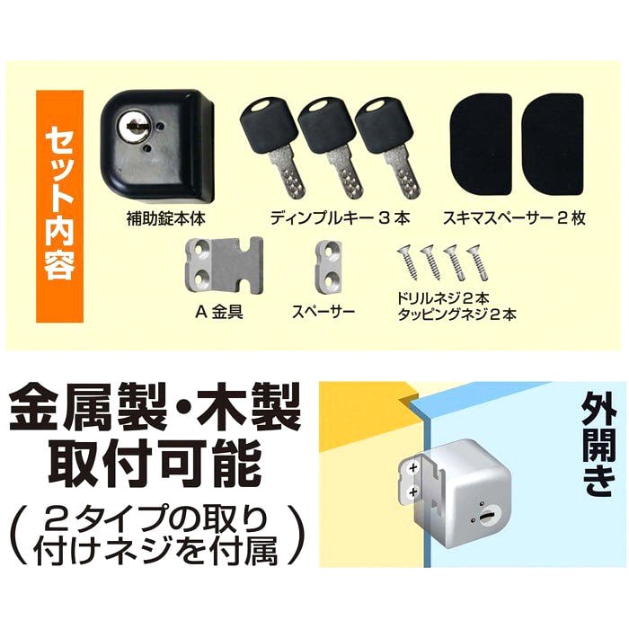 外開きドア、扉に「ネジ止め」にて後付できる「ディンプルキータイプ」のドア用補助錠。ロッカー・物置・倉庫・引き出しに最適!室内ドア・勝手口・被せ扉に最適!キー3本付。金属製・木製取付可能。(2タイプの取り付けネジを付属)