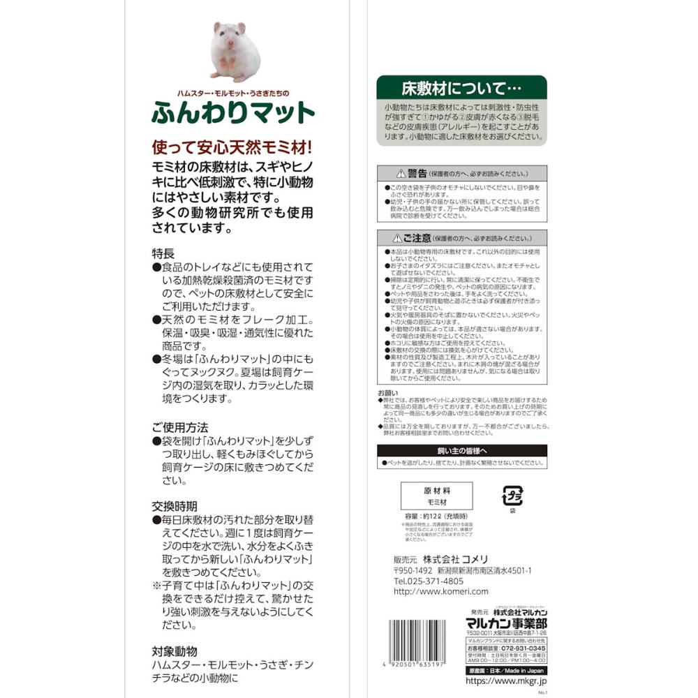 ご使用方法:袋を開け「ふんわりマット」を少しずつ取り出し、軽くもみほぐしてから飼育ケージの床に敷きつめてください。