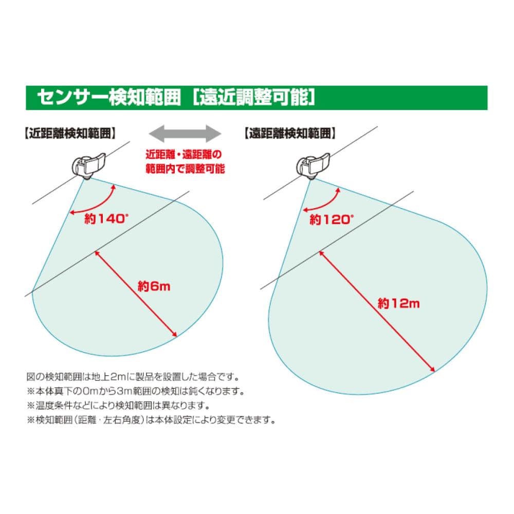 ●感知範囲:最小約6m約140°、最大約12m約120°(取付位置地上約2m)