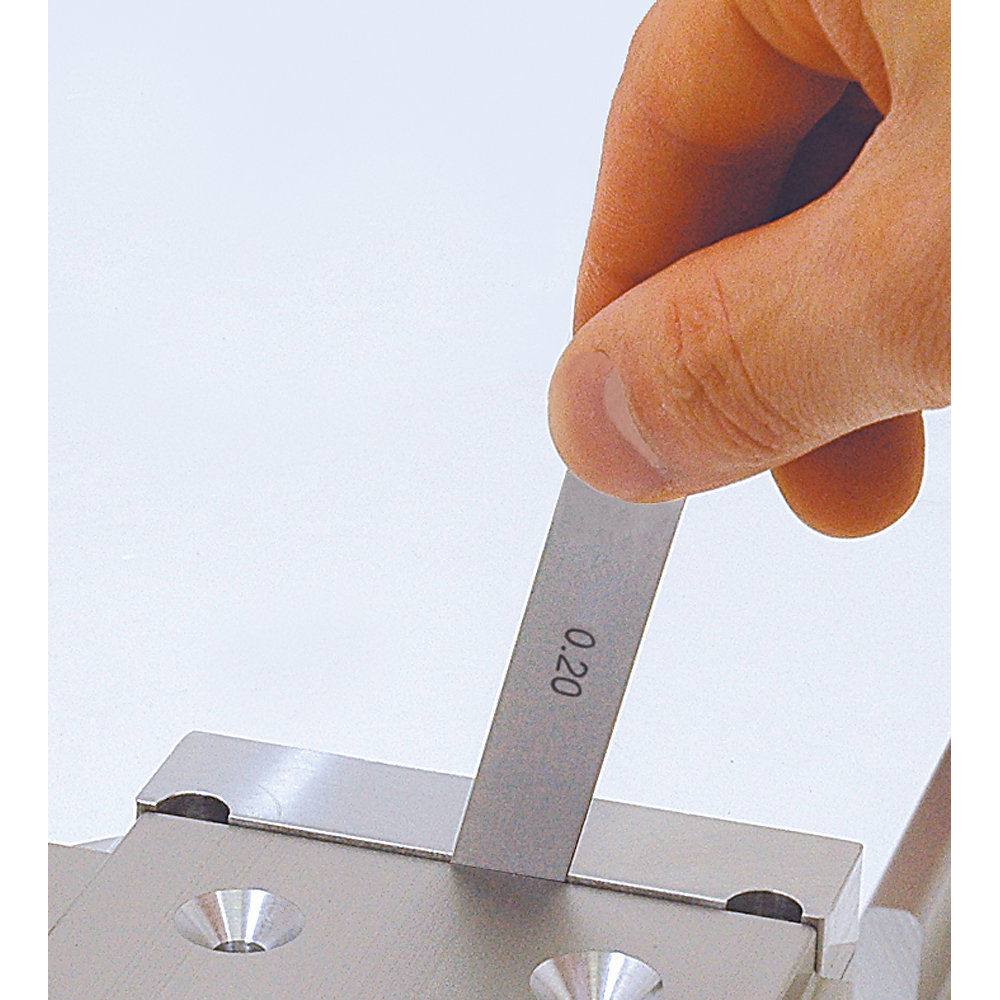 "リーフの厚み 1.00、0.03、0.04、0.05、0.06、0.07、0.08、0.09、0.10、0.11、0.12、0.13、0.14、0.15、0.20、0.25、0.30、0.35、0.40、0.45、0.50、0.60、0.75、0.80、0.90。 材質は炭素工具鋼で、ビニールケース付。"
