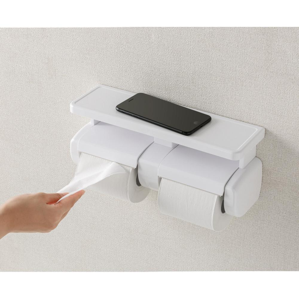 ■小物置きにも便利な棚付き。 ■ワンタッチでペーパー交換ができます。 ■専用のアタッチメント(=シャフト)が付属しているので、コアレスタイプ(芯なし)のトイレットペーパーにも対応。