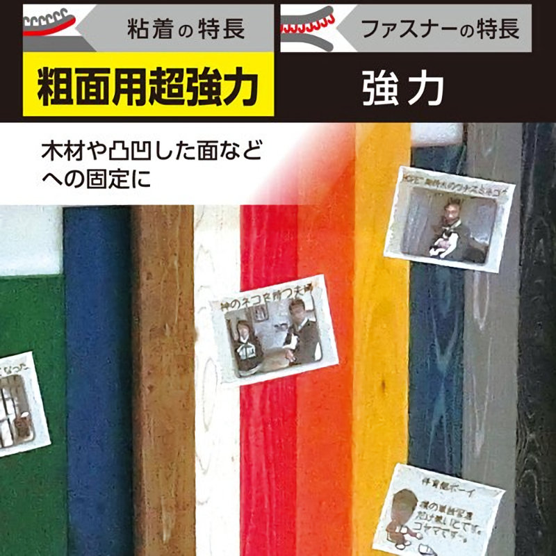 サイズ 25mm×500mm カラー 黒 A面とB面を貼り合せた使用する面ファスナー 繰り返し何度も引き剥がして使用できます。 木材などのザラザラ面にも良くつく超強力な粘着剤です。 柔らかい材料なので肌あたりも柔らかです。 糸に伸度があるので、はがすときは滑らかに剥がれます。 ハサミで好みのサイズにカットして使用できます。 <注意> ・貼り付ける面の水分、油分、ホコリなどをきれいに取り除いてください。 ・十分な圧力をかけて貼り付けてください。 ・10℃以下の環境では粘着力が低下します。 ・貴重品、壊れやすい物、重量物への使用はしないでください ・高温多湿となる場所、直射日光の当たる場所での保管は避けてください。 ・フッ素処理面、シリコン、軟質塩ビ、PP・PE、凹凸の激しい面には接着できません。 ・水に浸けた状態では強度が下がります。 貼付後、粘着剤がなじむまで約1日は負荷を加えないでください。