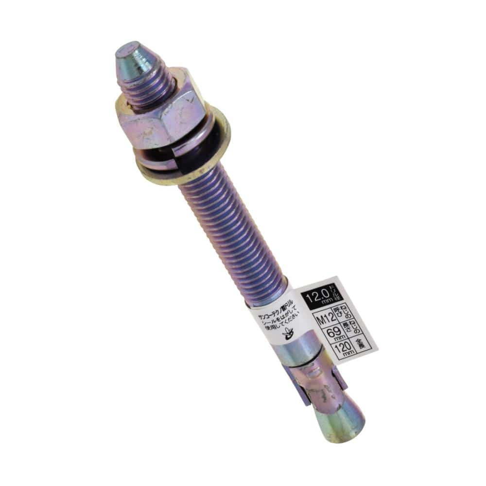 JCAA認証品とSHASE-S規格品に基づく主要寸法。材質は鉄で三価クロメートめっき。施工管理の目安となるラインマーク付き。引張力に追従し拡張部が開く「追従拡張機能」で安定した強度を発揮します。施工後でも頭部刻印によって全長の確認が可能。医療機器取付、通信架台取付、プラント設備工事、機器設置等に。
