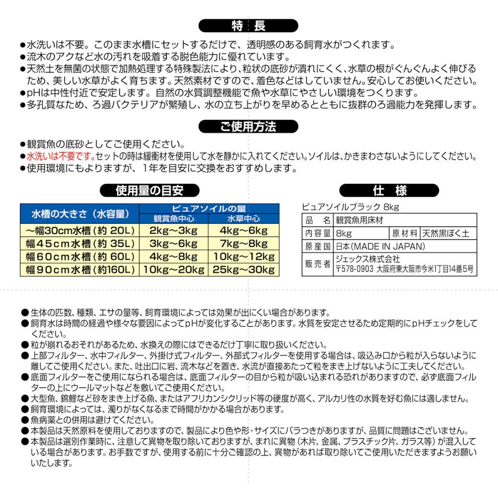お取り扱い上の注意:●飼育水は時間の経過や様々な要因によってpH値が変化することがあります。水質を安定させるために定期的にpHチェックをしてください。●水換えの際にはソイルをできるだけ丁寧に取り除いてください。●フィルター等を使用する場合は、吸込み口からソイルが入らないように離してご使用ください。●底面フィルターを使用する場合は、底面フィルターの上にウールマットなどを敷いてください。●他の砂利などを混ぜないでください。