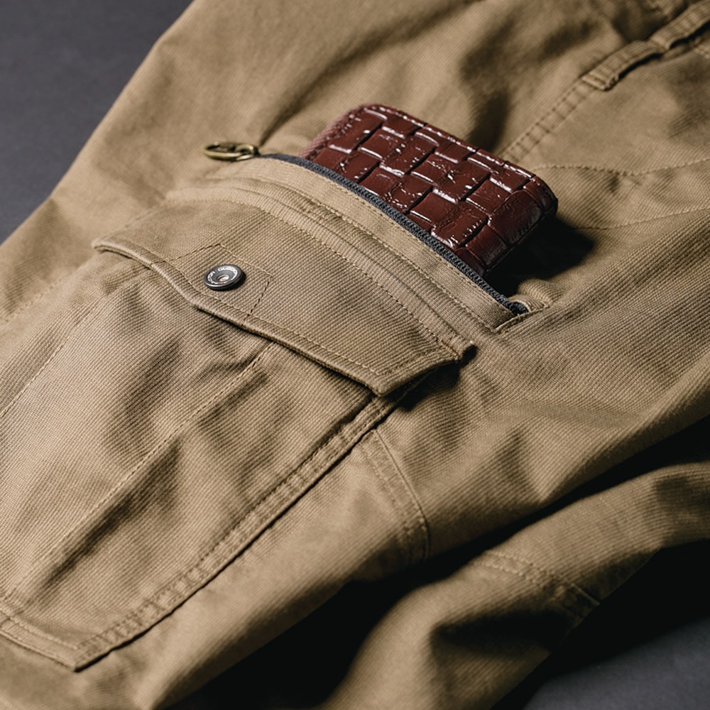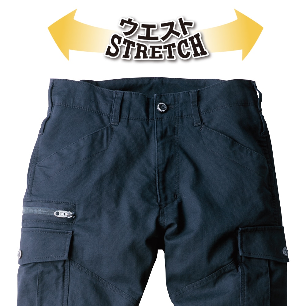 ウエストストレッチ。ヴィンテージタイプの腰裏。動きやすい股下クライミングカット。便利なカラビナループ付き。右サイドのマルチポケットは深めで長財布も収納可能。