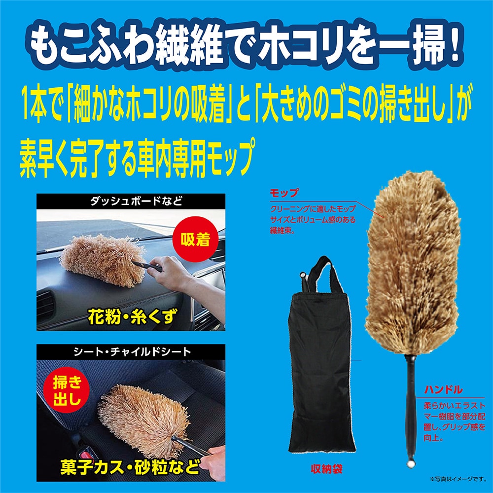 車内のホコリや花粉などの細かい汚れを「吸着」するだけでなく、砂粒やお菓子のかすなど大きめのゴミの「掃き出し」が素早く完了する車内クリーニング専用のハンディモップ。