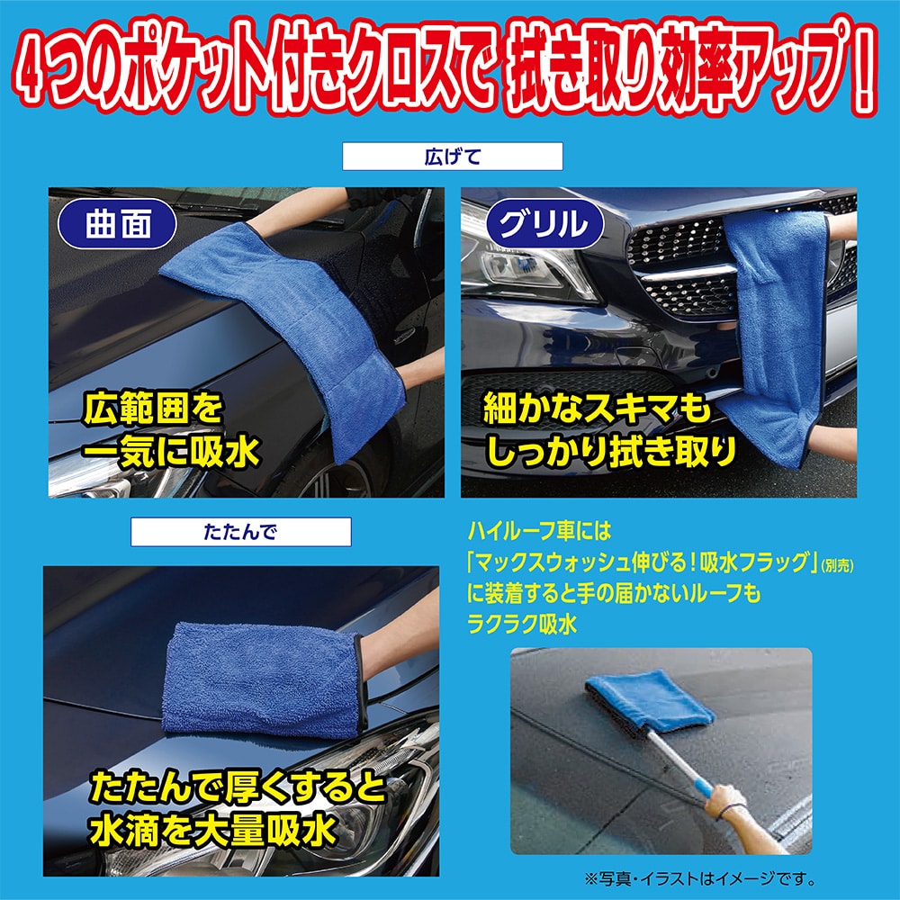 4つのポケット付きクロスで拭き取り効率もアップし、水滴拭き取りの手間と時間が大幅に軽減します。