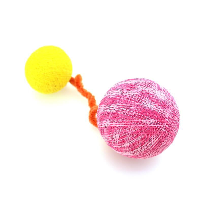 軽くて爪がひっかかりやすい、2つのボールがつながったタイプのおもちゃです。猫ちゃんの大好きな「カサコソ音」に、ひもでつながっているからこっちをつつけば、あっちもころころ。猫ちゃん大興奮!