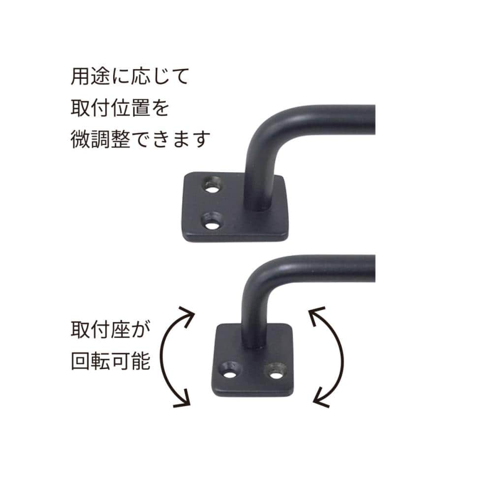 しっかりとした素材感のアイアンバー。シンプルなデザインで、インテリアスタイルを選びません。取付座の角度を自由に変えられ、様々な場所に取付可能。取付座が回転可能。用途に応じて取付位置を微調整できます。多用途に使えます。(取付ビス付属)使用例:マガジンラック、キッチン収納、シューズラックに、バーカウンター等。
