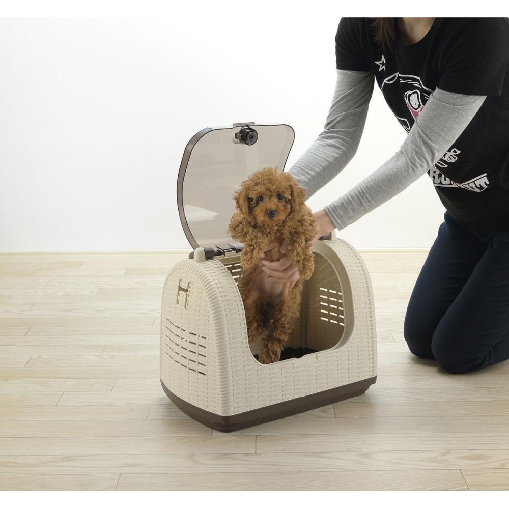 ラタン風のおしゃれなキャリーです。通気性を考慮した快適設計です。広い開口部で、ペットの出し入れがスムーズにできます。引っ掛け部にシートベルトを掛けるだけで、簡単に固定できます。持ち運びやすい大きめのハンドル付きです。ドアの開け閉めがしやすい、手掛け部付きです。ドアは簡単にロック・解除が出来ます。超小型犬・猫・うさぎ用。使用体重目安:5kg以下