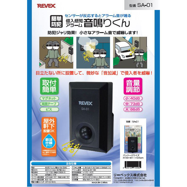乾電池式で電源の無いところでも設置できます。 防犯砂利効果。 アラーム音で威嚇します。 簡単取付(マグネット付き、両面テープ付、ビス付き)。音調は3段階調整可能(40db、73db、86db)。屋外設置OK(防沫仕様IP44)