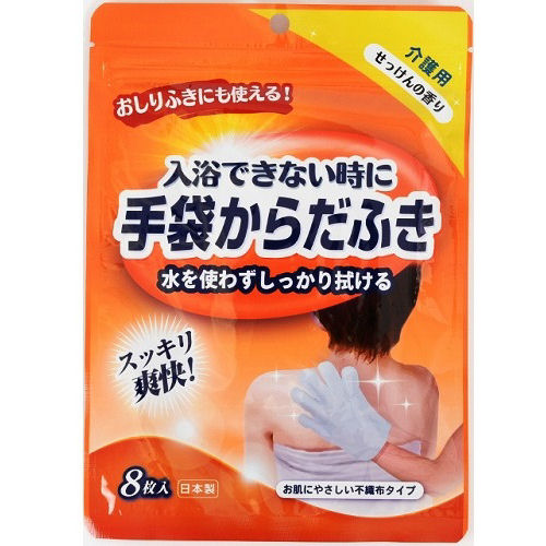 ●素材:レーヨン、ポリプロピレン ●成分:Pg、アロエエキス、ウンシュウミカン果皮エキス、防腐剤●手袋をはめて拭くだけなので誰でも素早く簡単に使うことができます。●手袋型のため拭きにくいところの汚れも力を入れてしっかりと拭き取ることができます。●保湿効果の高い温州みかんの果皮エキスを配合しているため、お肌を乾燥から守ります。●ノンアルコール、ノンパラベンなので刺激が少なく高齢者にもお使いいただけます。●無香料タイプ●電子レンジなどで温めて使えます。