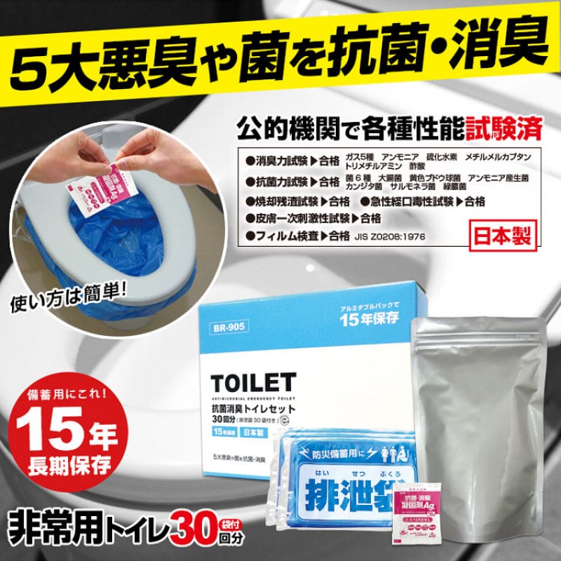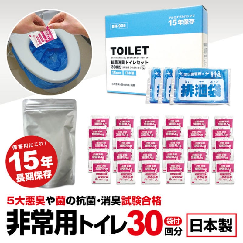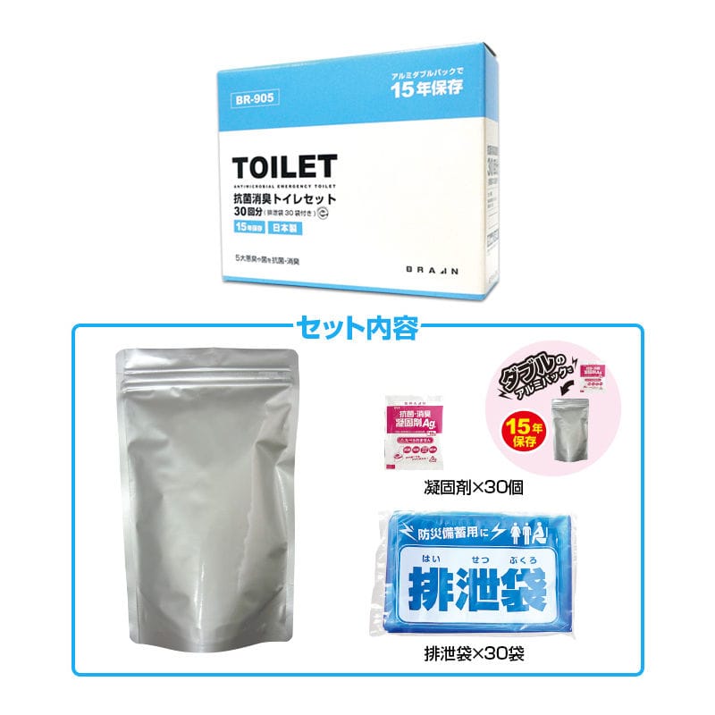 ●セット内容:アルミ凝固剤30個入りアルミパック×1 汚物袋×30袋●材質 凝固剤:吸水ポリマー、ヤシ殻活性炭、銀 汚物袋:ポリエチレン●水が使えない状況でも汚物袋をかぶせるだけで用を足すことができます。使用後に凝固剤をふりかけるだけ。ジェル状に固まりゴミとして廃棄可能です。●凝固剤は1回分ずつアルミパックで密封されているので、開封しない限りそれぞれ長期の保存が可能です。さらに!そのアルミ凝固剤をアルミパックに密封しました!これで15年の保存が可能となりました!●銀を配合しているので抗菌作用があり、感染症の原因となる大腸菌や黄色ブドウ球菌の繁殖を抑えます。大阪市立工業研究所の抗菌力試験でも抗菌力が認められました。●ヤシ殻活性炭を配合。消臭効果があり快適に使用できます。 (財)日本食品分析センターの試験でも消臭効果が認められました。●公的機関で各種性能検査テスト済み。抗菌力、消臭力、焼却残渣、急性経口毒性、皮膚一次刺激性のテストを実施済みです。●1回に凝固剤を1個ご使用下さい。