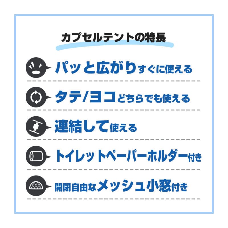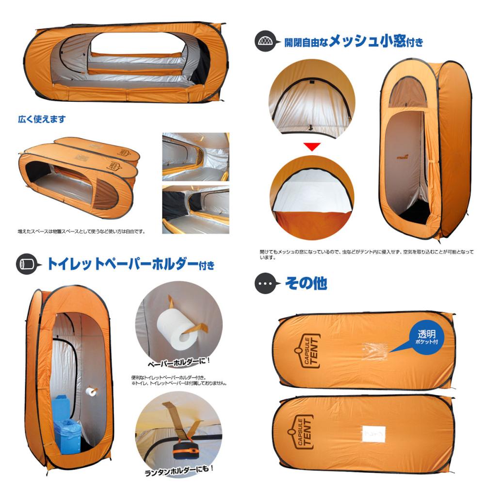 ●プライバシー確保に!どこでも簡単に設置可能!そこが個室に早変わり!●テントはワンタッチで組み立て可能。特に難しい作業無くカンタンです。●使い方は自由!アウトドアテント、災害時の防災テント、防災用トイレテント、着替え用テントなどとして使用可能です。砂袋付きなのでどこでも置けます。●縦置きでも横置きでも使えます。横に置けばごろんと楽に寝転がれるスペース。身長180cmの男性が寝転んでも余裕があります。縦置きにすれば、着替え等に便利です。●メッシュ窓を2か所設けました。プライバシーを確保したい時はジッパーで完全に閉じることが可能です。●トイレテントとして使えるように側面にトイレットペーパーホルダーを付けています。トイレットペーパー、簡易トイレは付属しておりませんのでご了承下さい。