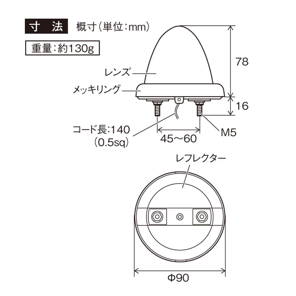・定電圧回路採用で電圧による明るさの変化を防止。 ・樹脂ダイヤカットレンズで煌めきアップ。 ・特許登録 第4484753号 ・主材質:[レフレクター]PP・鉄/[リング]ABS(クロームメッキ)/[レンズ]アクリル ・コード長:約140mm(0.5sq ) ・重量:約130g ・定格電圧範囲:DC10-32V ・定格電流:(DC14V時)約110mA/(DC28V時)約60mA ・使用LED数:9個 ・付属品:フランジナット M5(2個) ※車両コードとの接続部防水処理を確実に行なってください。
