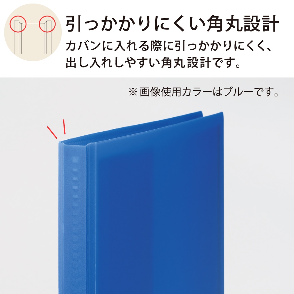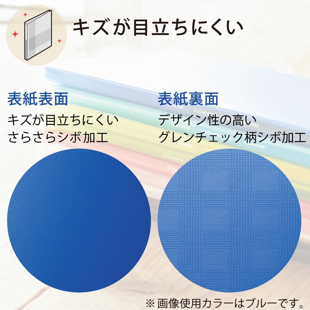 傷が目立ちにくくデザイン性の高いシボ加工表紙と、スリムな背幅と角丸加工で携帯性に優れたクリヤーブック