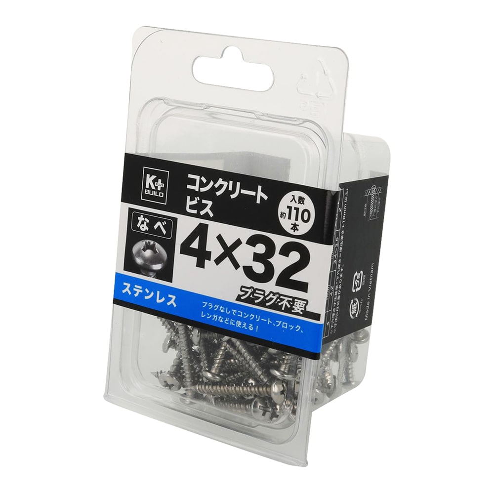 軽量物の取り付けに使用します。材質はステンレス(SUS410)。特殊なねじ山が高い引き抜き強度を発揮します。プラグなしでコンクリート、モルタル、レンガなどにご使用できます。下穴径 3.4mm使用荷重 22kgf。