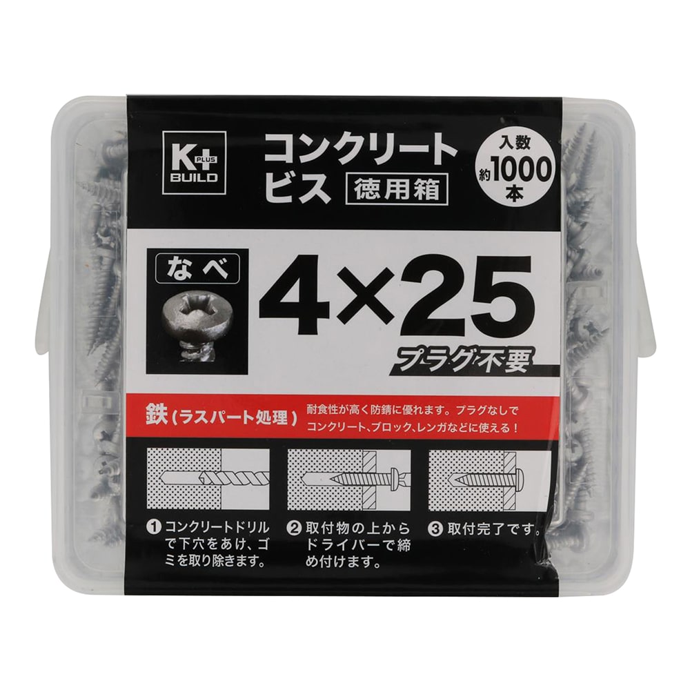 軽量物の取り付けに使用します。材質は鉄で表面処理はラスパート。特殊なねじ山が高い引き抜き強度を発揮します。プラグなしでコンクリート、モルタル、ブロックなどにご使用できます。下穴径 3.4mm使用荷重 22kgf。