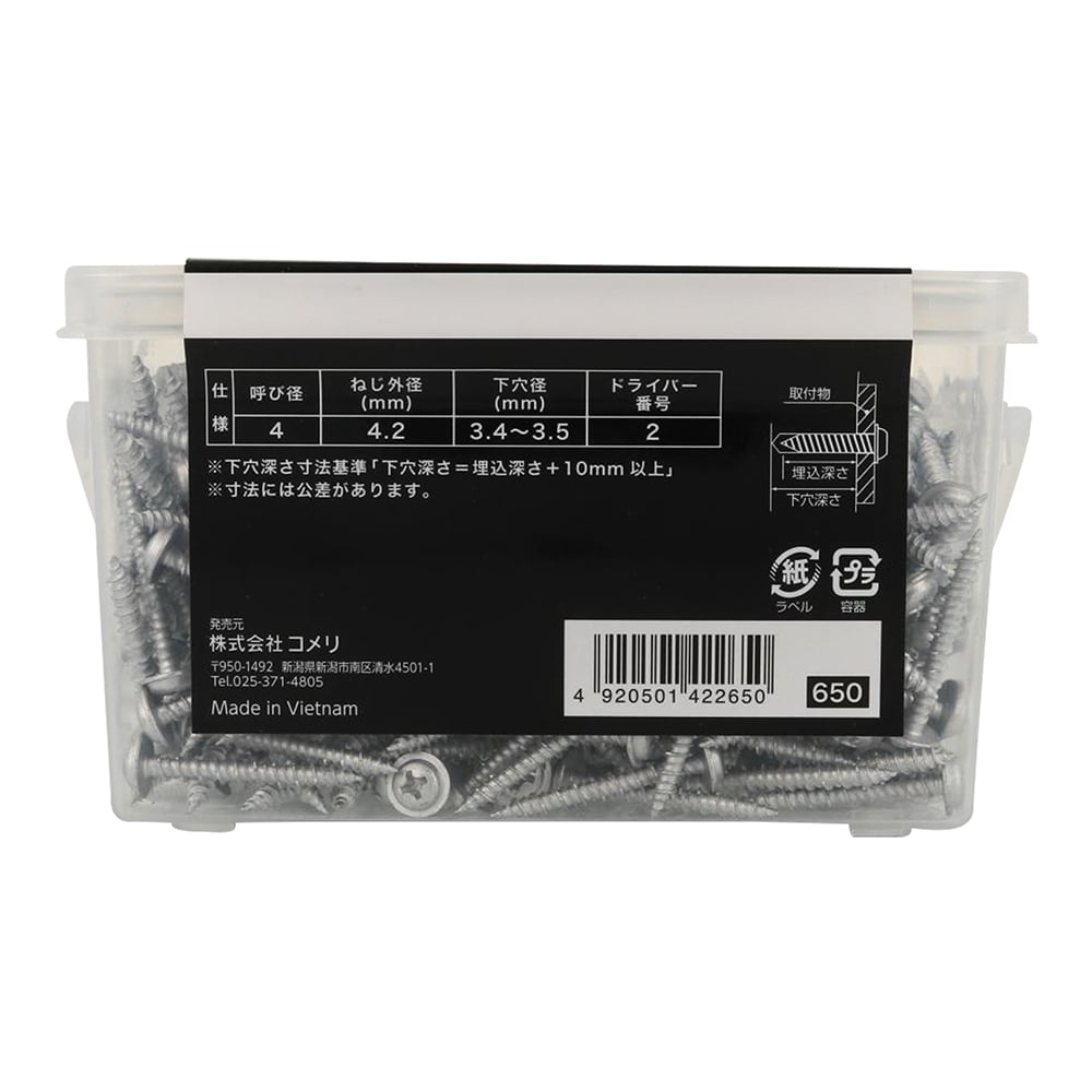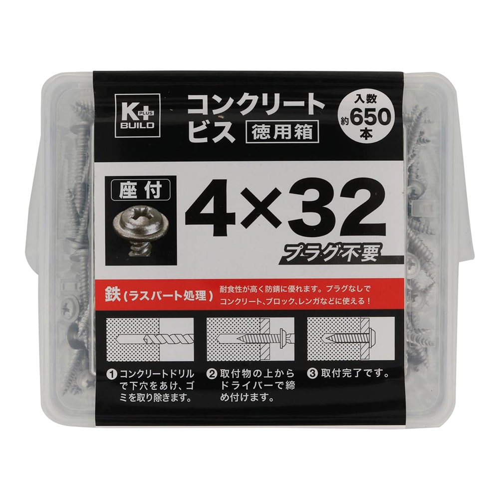 軽量物の取り付けに使用します。材質は鉄で表面処理はラスパート。プラグなしで締結できます。コンクリート、モルタル、ブロックなどにご使用できます。下穴径 3.4mm使用荷重 22kgf。