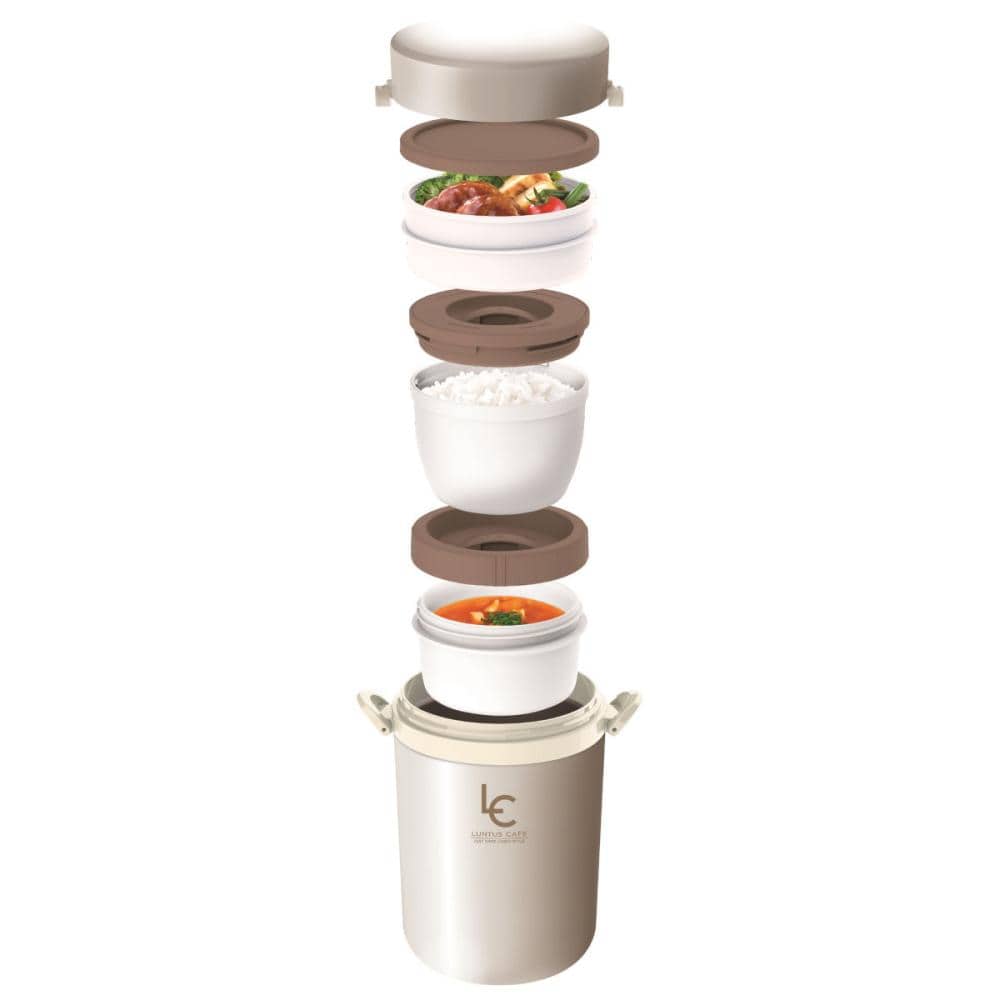 容量:ごはん容器250ml 、おかず容器250m 、スープ容器200ml 保温ケース=ステンレス鋼(アクリル樹脂塗装) ご飯容器フタ=ポリプロピレン(中材:発泡PP断熱材) 保温ケースフタ・リング・止め具・ご飯容器本体・おかず容器本体・スープ容器本体・スープ容器フタ・弁本体=ポリプロピレン おかず容器フタ・スープ容器フタパッキン・エア弁=シリコーンゴム