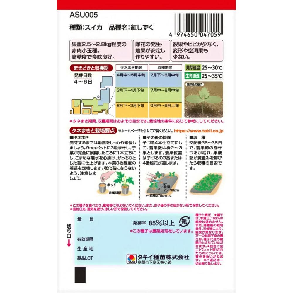 ●掲載のパッケージ画像(表側・裏側)に記載されている蒔き時期、収穫時期、発芽適温、発芽率、品種特長、その他注意事項をよくご確認の上、ご注文ください。