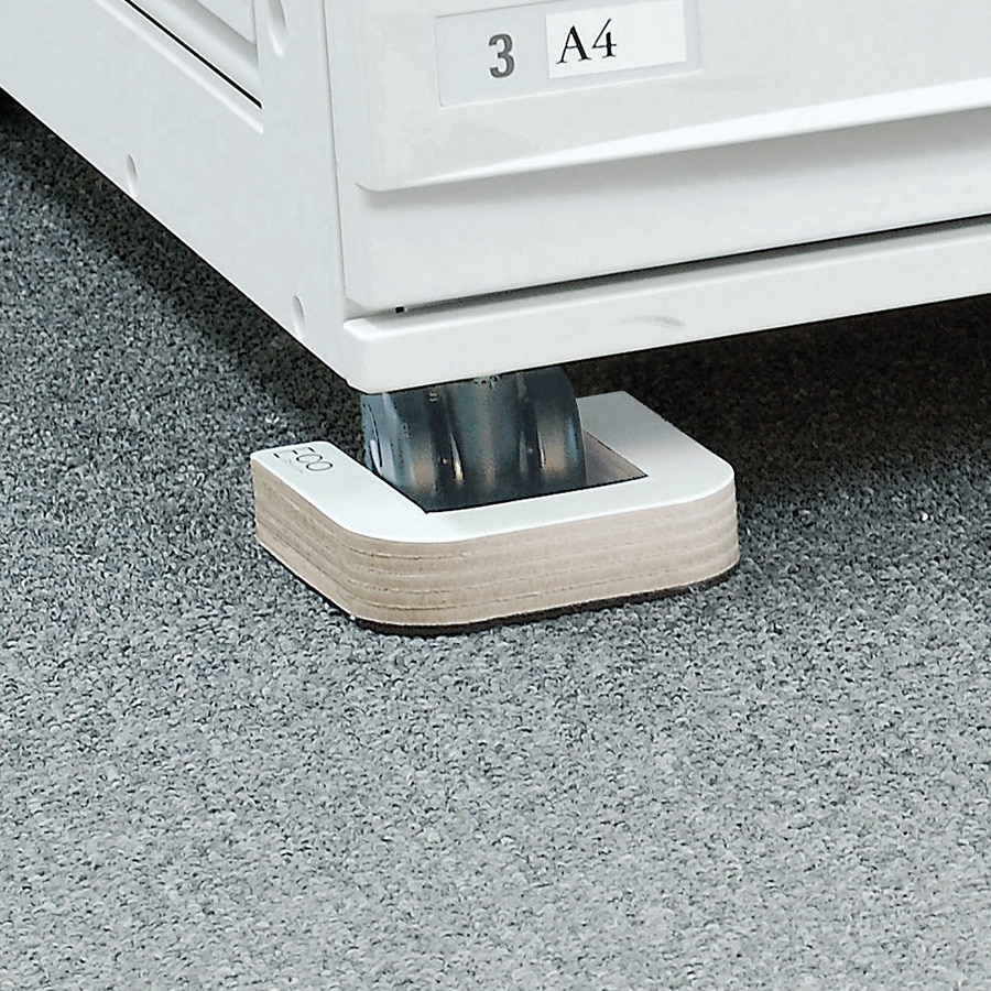 主原料は再生紙です。耐用年数約8年。使用可能床面はフローリング、カーペット、たたみ、タイルなどです。前後4ヶ所のキャスターすべてに設置することで、しっかりと固定し走り出しを防ぎます。耐荷重1個あたり100kg。