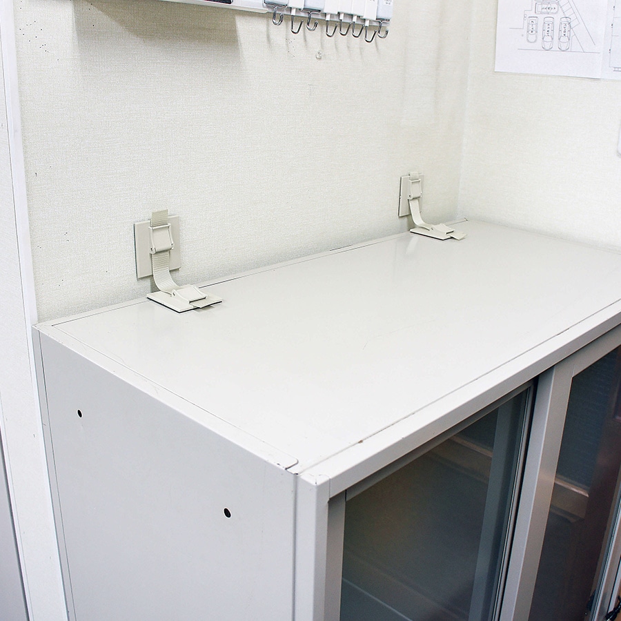 書庫、ロッカーなどの重量物に。上部や側面など様々な設置ができ、繰り返し使用可能。強力粘着ゲルで書庫や冷蔵庫をしっかり固定し、転倒を防止します。バックル式でベルトを外せば、移動や掃除が簡単。耐用年数は約8年。耐荷重は約160kg。